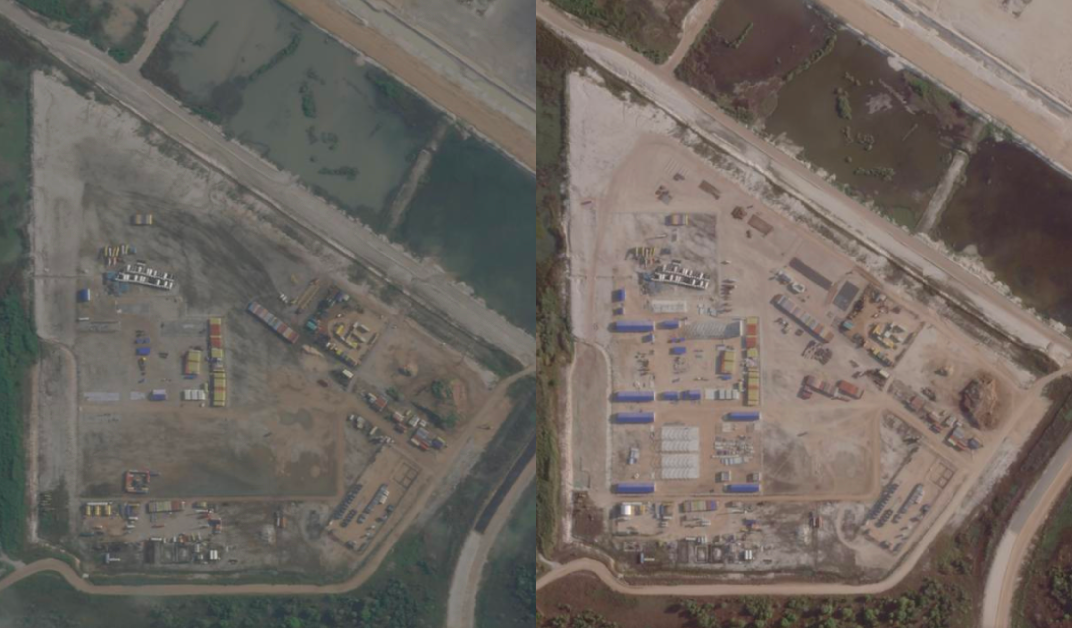 Major construction work now appears to be underway at the project site. Comparing recent satellite imagery to comparable imagery from April reveals a specific area that has seen the most significant work, including construction of buildings.