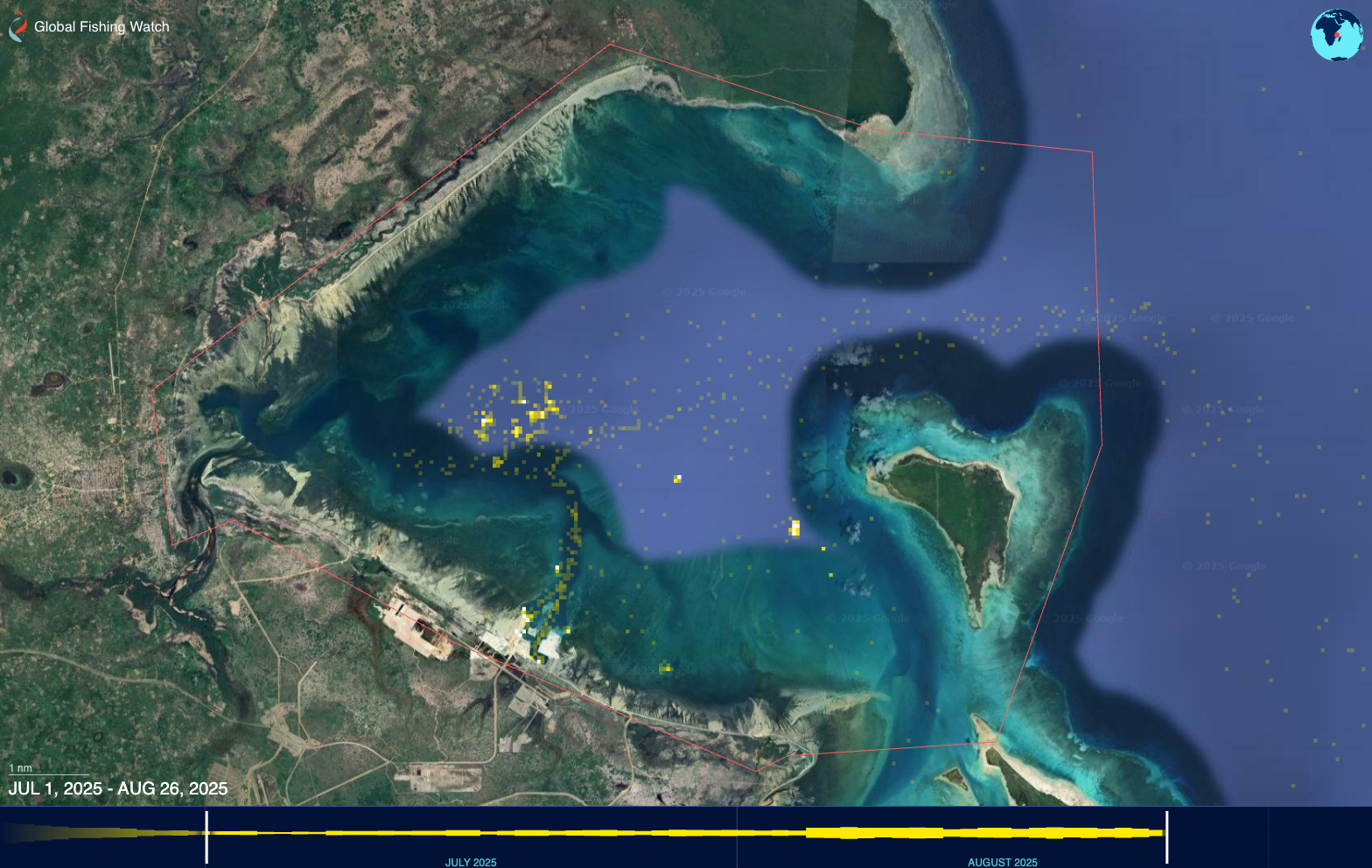 AIS data aggregated by the Global Fishing Watch project shows an increase in vessel activity in Palma Bay from mid-August. Vessels involved — visible via the GFW web interface — include the Gombessa (IMO 8733897, a passenger vessel) and the Topaz Tobol (IMO 9812224, a heavy load carrier).